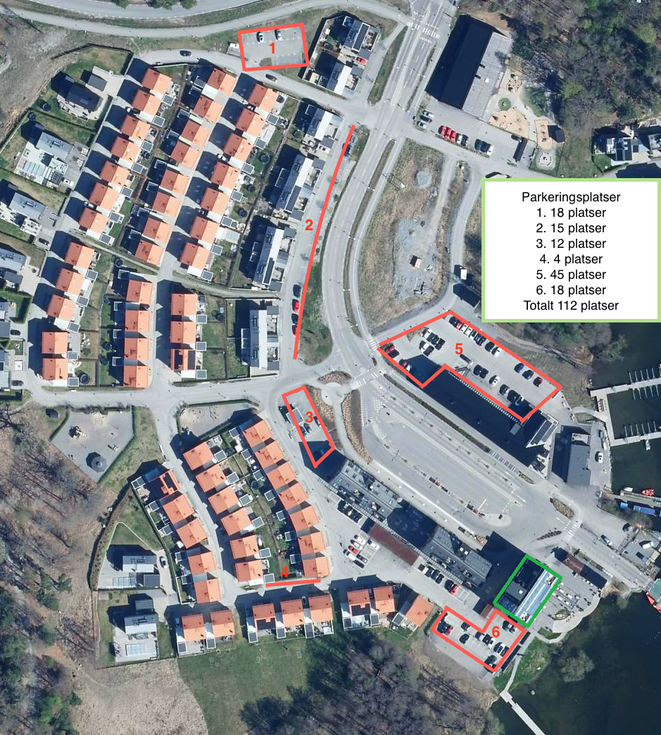 Restaurangen är markerat i grönt och röda anvisningar är parkeringsmöjligheter.